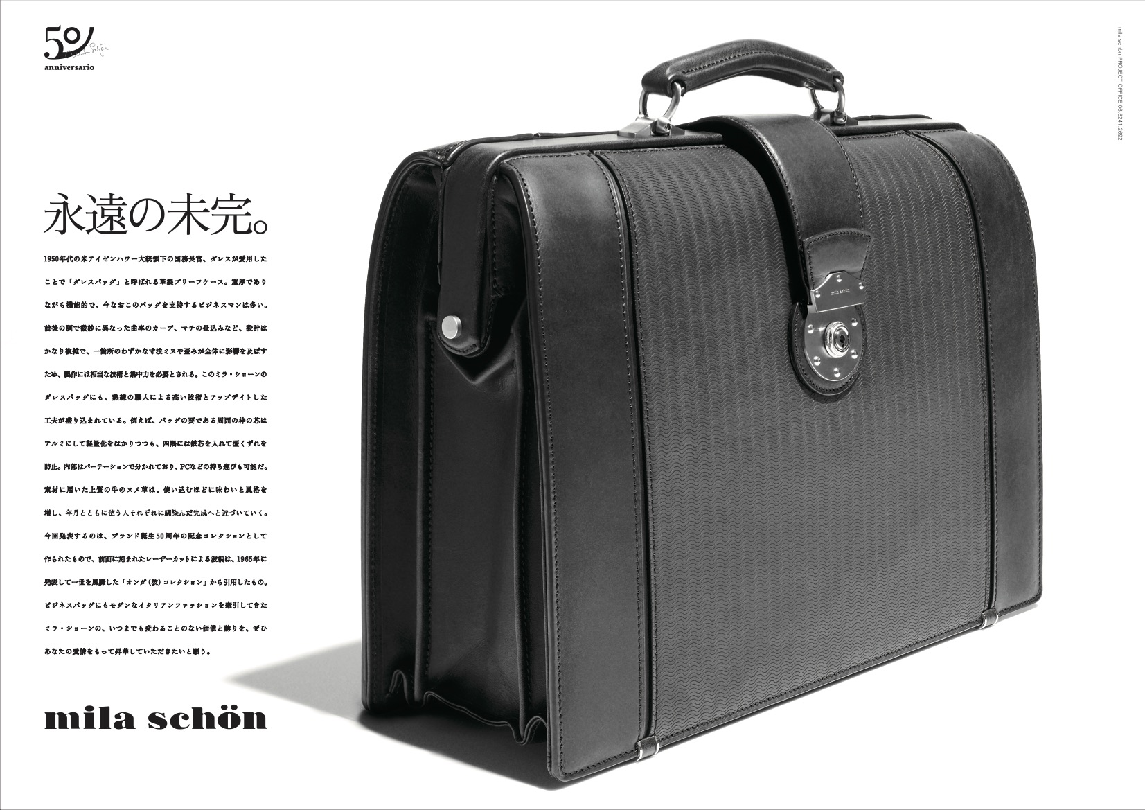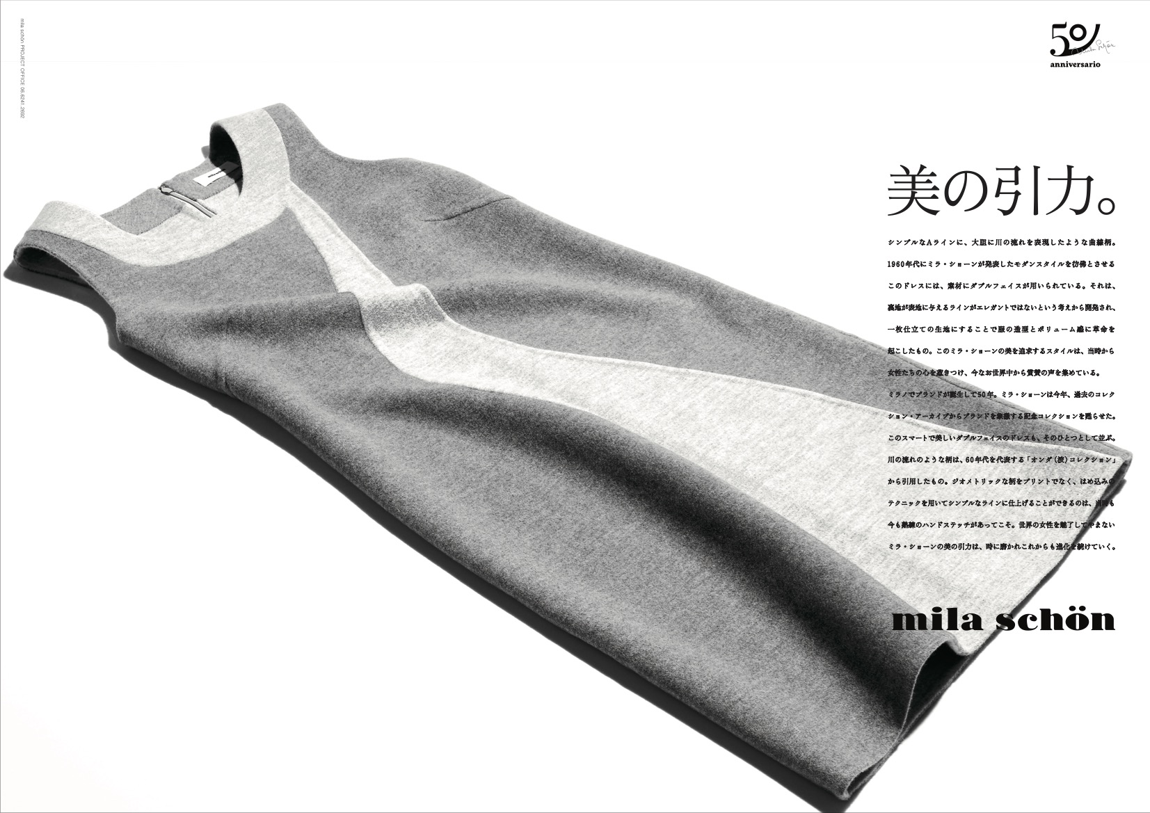 ミラショーンが日本で展開されて50周年を記念して、流行通信で行った4連のシリーズ広告です。文章はハイブローな空気を出しつつ、とがり過ぎないようにしたように記憶しています。内容が濃いのでキャッチコピーはわかりやすくしました。