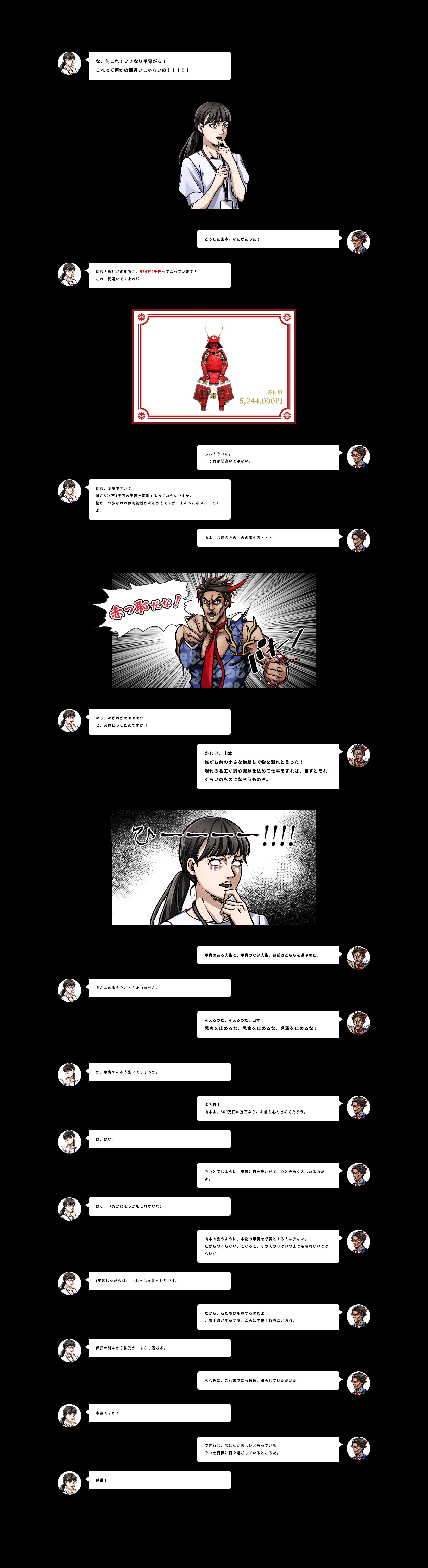 九度山町企画公室に実際にいらっしゃる松岡係長を起用した、劇画的パロディです。登場する甲冑は本物の返礼品で約500万円します。