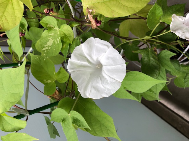 去年できた数百個の朝顔の種から、今年も白朝顔が!